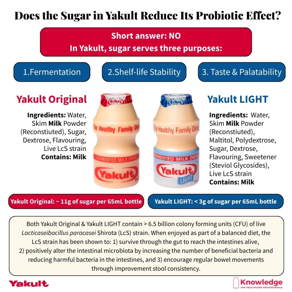 Based on current evidence, there is no indication that the sugar present in Yakult reduces the viability or survival of the LcS strain.4 The probiotic bacteria are cultured, stored, and delivered in the presence of sugar, and bacteria counts are monitored through established quality control processes.
