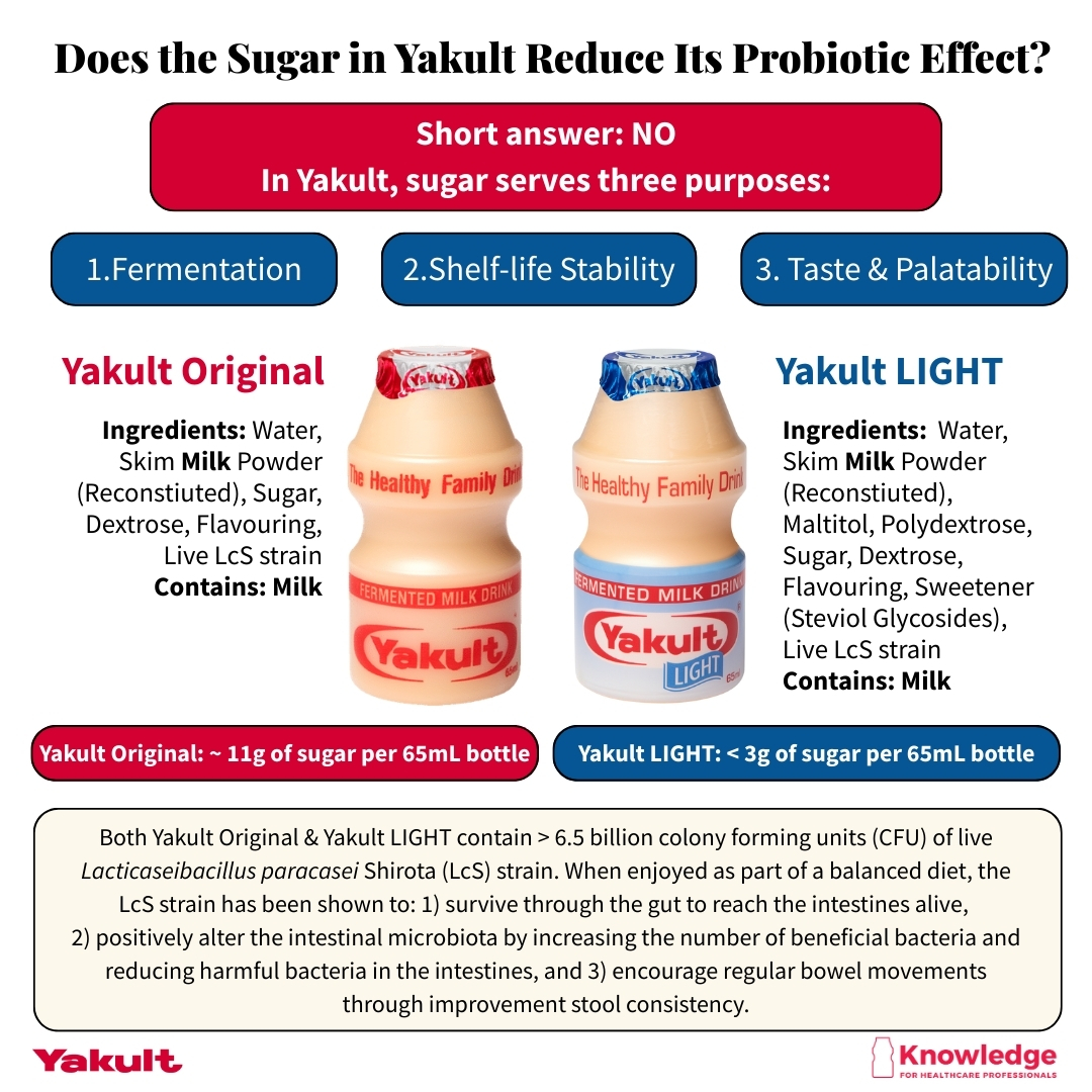 As with all probiotic foods, Yakult is designed to be consumed in a defined serving size and frequency. When considered within the context of usual dietary intake, its nutritional contribution should be interpreted alongside overall diet quality and individual needs. From a microbiological standpoint, the presence of sugar does not negate the probiotic effect of LcS. From a nutrition perspective, context and balance remain central to informed dietary choices.